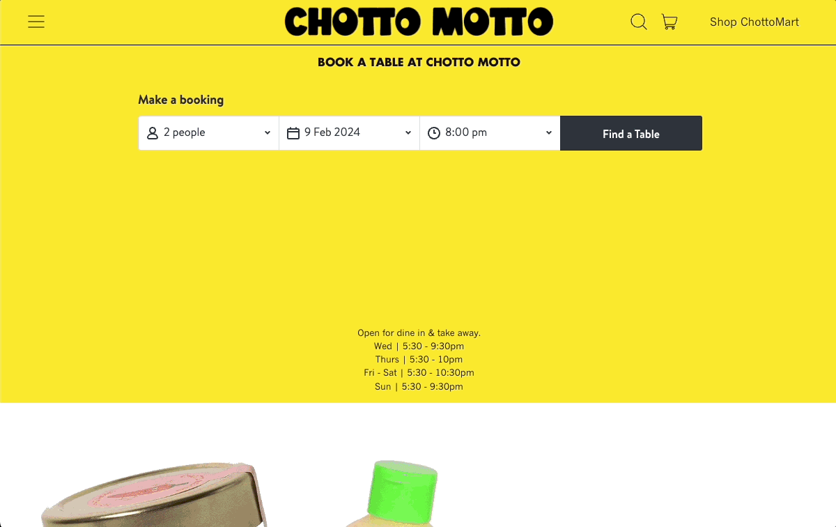 Pretty cool on how they have used one Shopify website for both their restaurant business by adding OpenTable embed and has Chotto Mart which is a collection of their products.