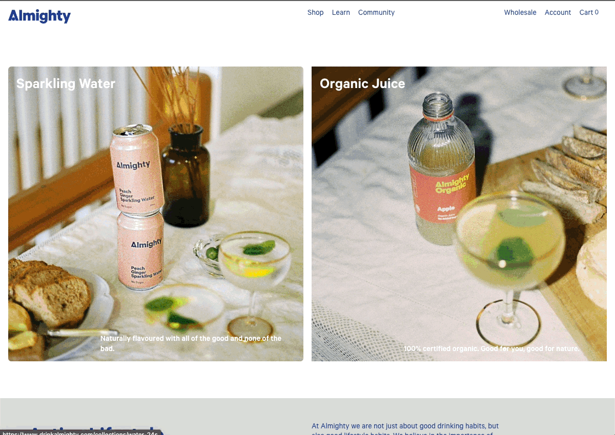 Almighty seems to have built a custom theme for their brand. The layouts are definitely not something you see very often. I do like how their mega cart-drawer functions and has upsells in it. Unfortunately seems like that has not been implemented on mobile.